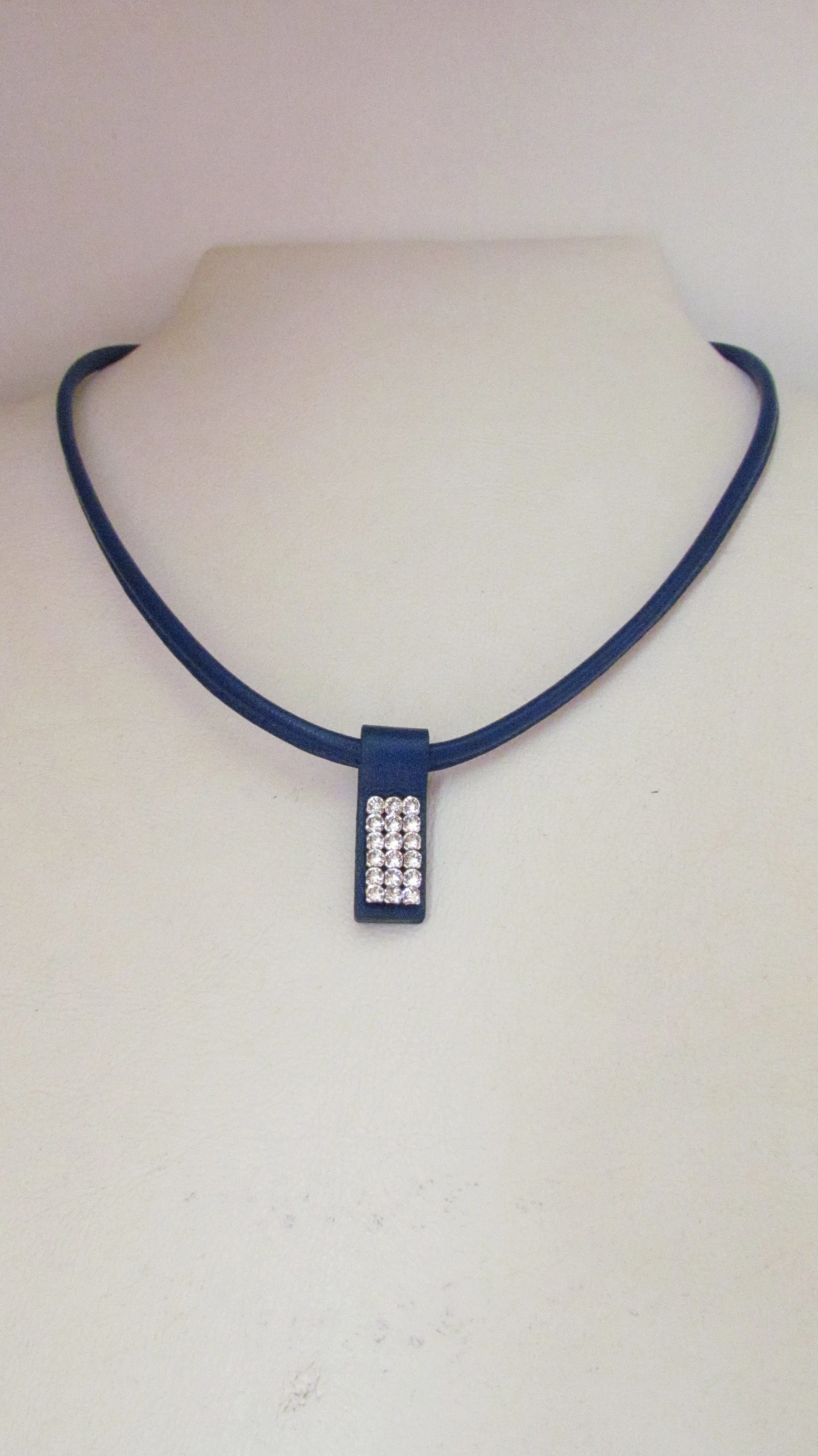 A nyaklánc Swarovski Elements kristályokkal díszített, királykék olasz bőr felhasználásával készült. A Swarovski Elements kristályok fehér színűek. Nem csak ragasztottak, hanem varrottak is. Swarovski kristály díszített terület: 3 kősorosan, 1.5 cm hosszan. A nyaklánc Hossza: 40 cm. Igény szerint módosítható. Minden termékre 6 hónap garancia van. Díjmentes szállítás 20.000 Ft feletti vásárlás esetén. Rendelés esetén : I.V.E. márka jelzéssel ellátott elegáns zárható csomagolás, használati utasítás (vásárlói tájékoztató), és logózott fekete organza ékszertartó tasak mellékelve.
