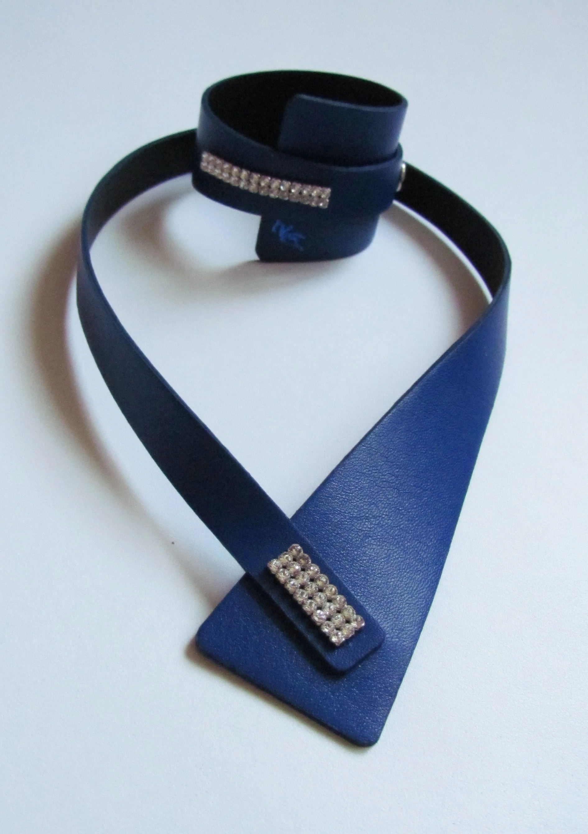 A nyakék: Swarovski Elements kristályokkal díszített, minőségi olasz bőr felhasználásával készült. A Swarovski Elements kristályok színe: fehér színűek. Nem csak ragasztottak, hanem varrottak is. Swarovski kristály díszített terület: 3 kősorosan, 2 cm hosszan. A nyakék hossza: 42 cm. 40.5 és 41.5 cm-nél hátul állíthatós patental záródik. Külön méretre is gyárható,mivel kötött a nyakék hossza.